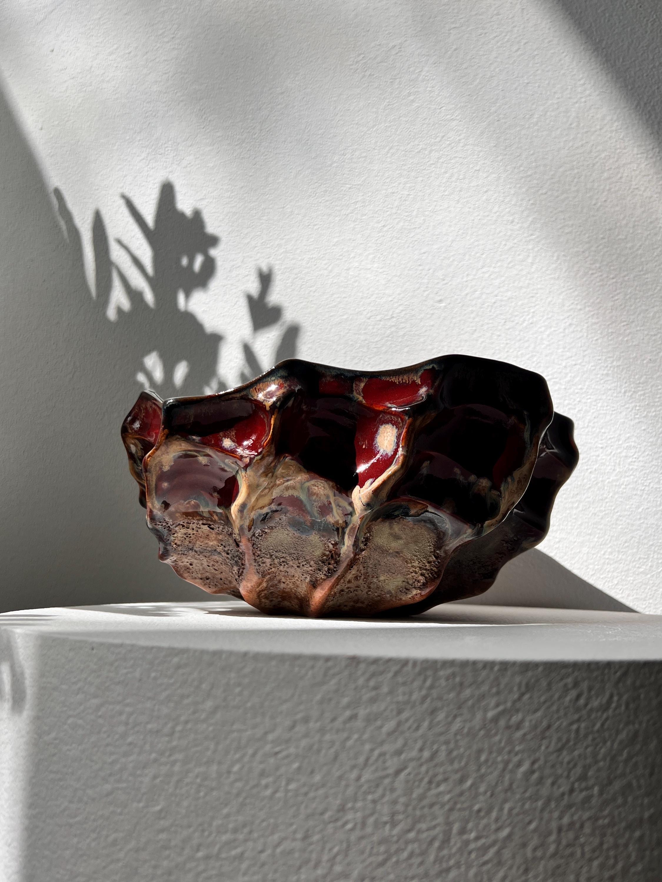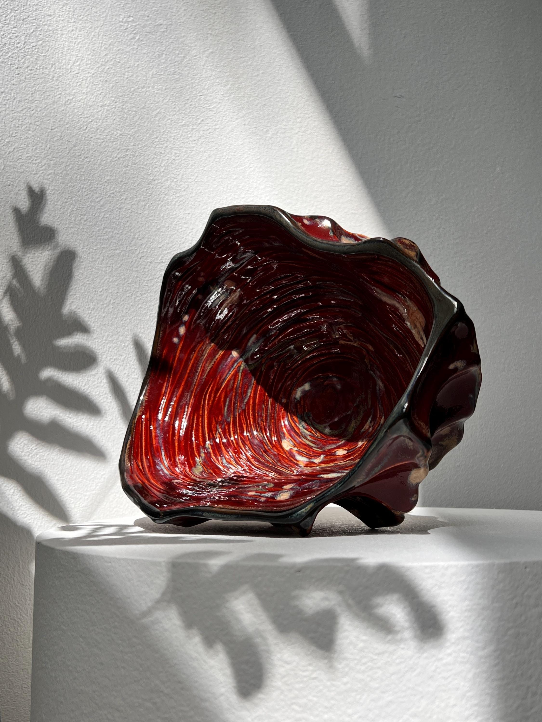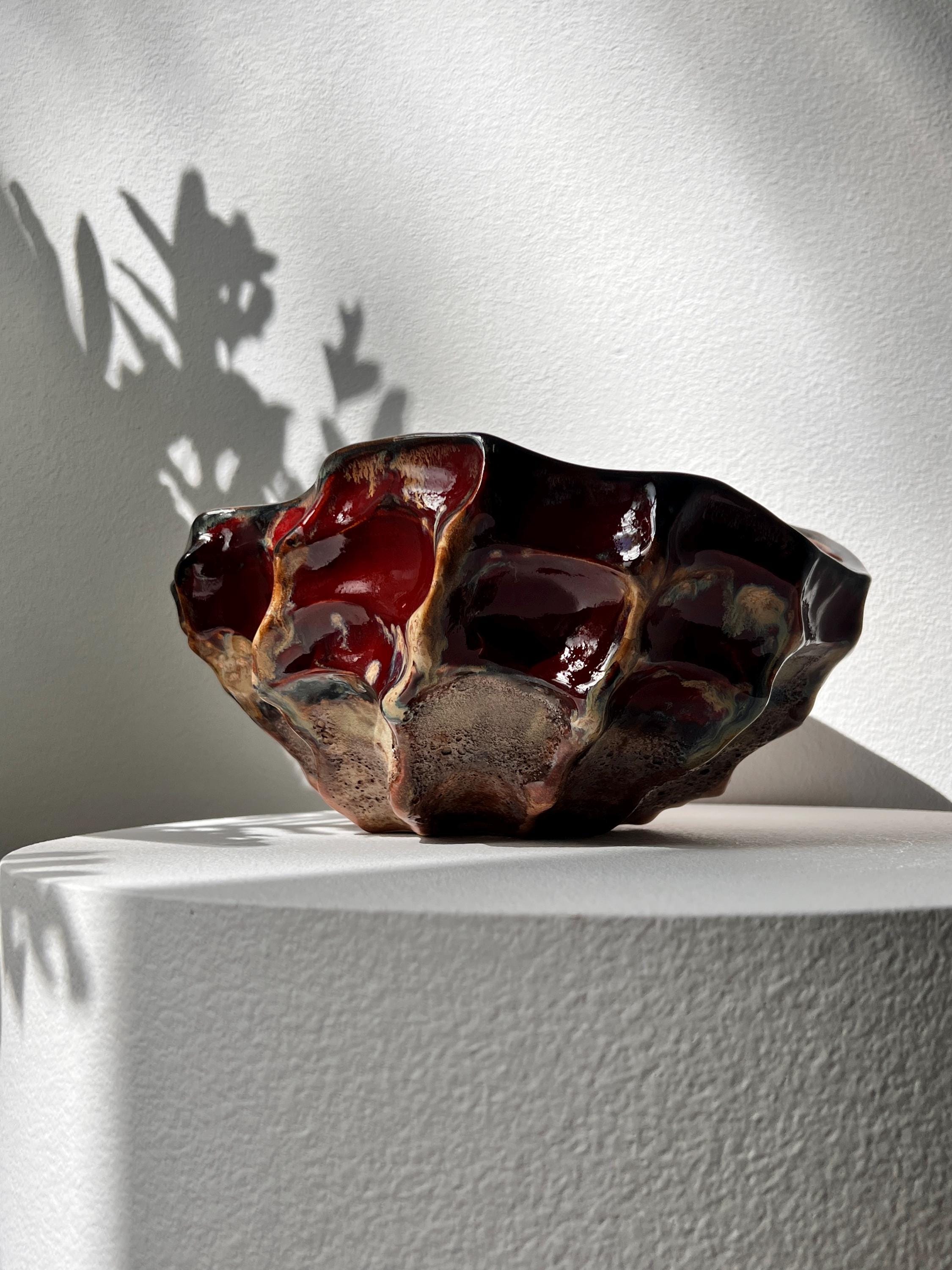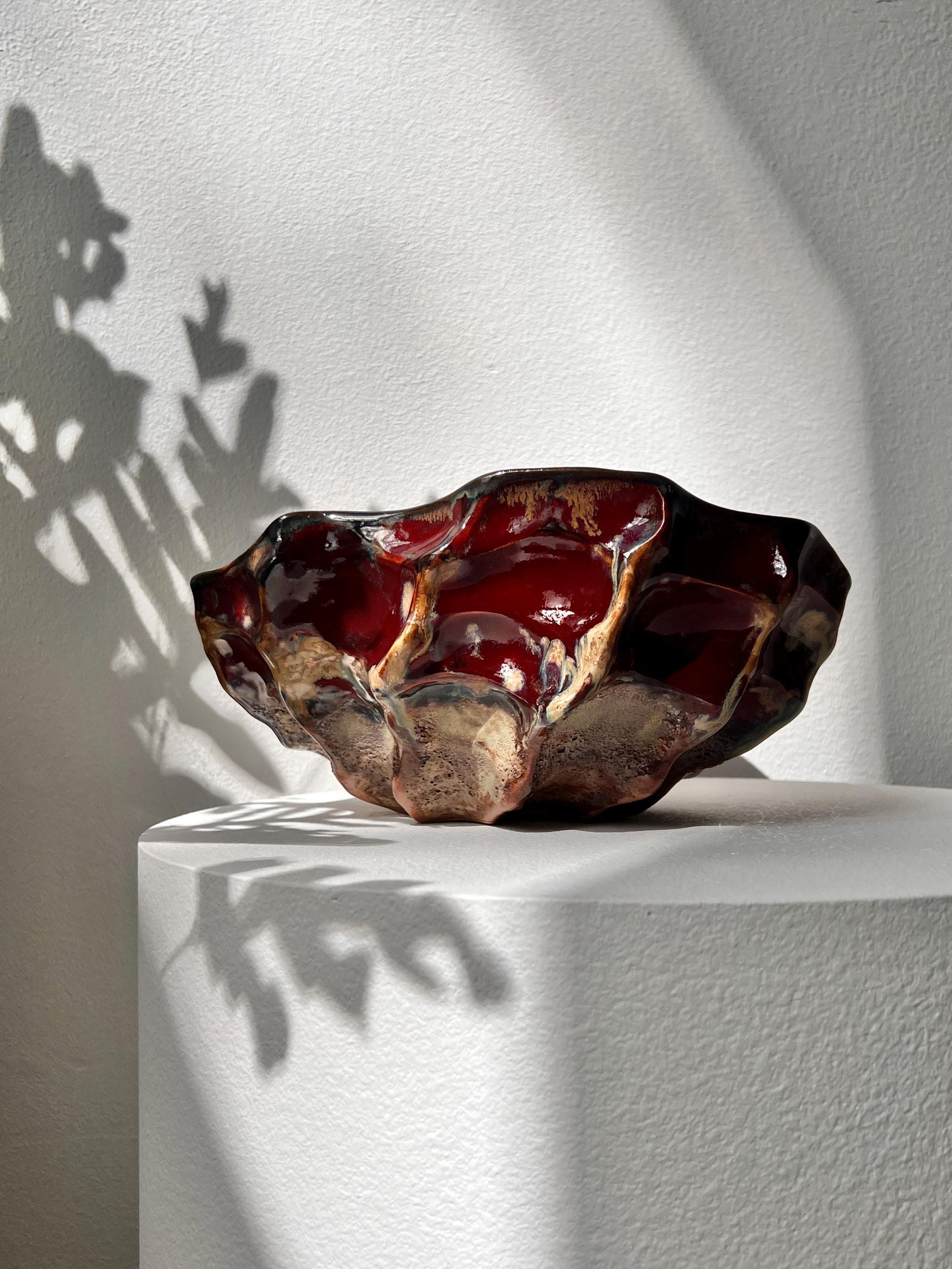 The interior is finished with a rich, glossy glaze in deep crimson which catche the light beautifully, while the exterior contrasts with earthy, raw textures and darker, volcanic hues.