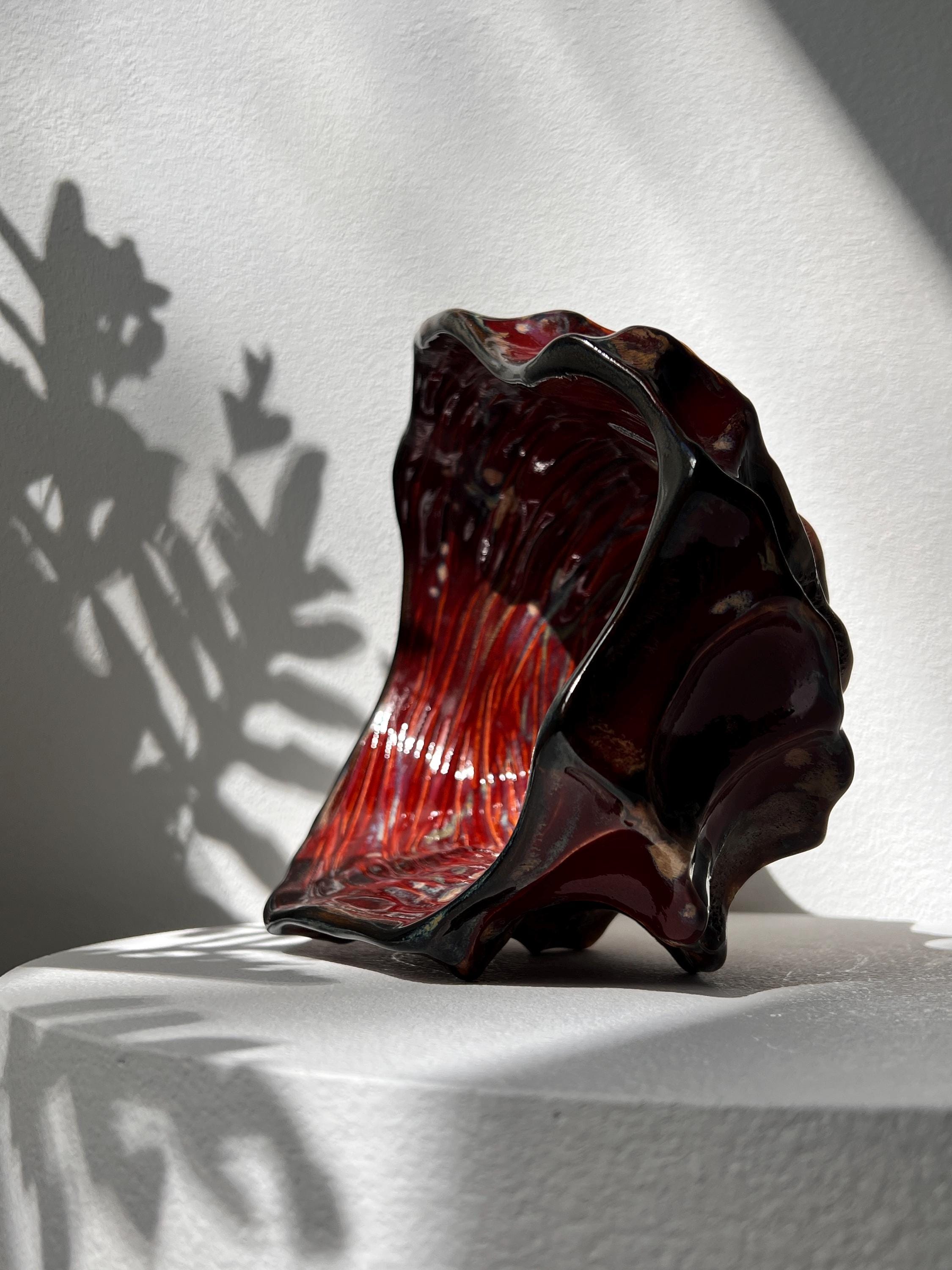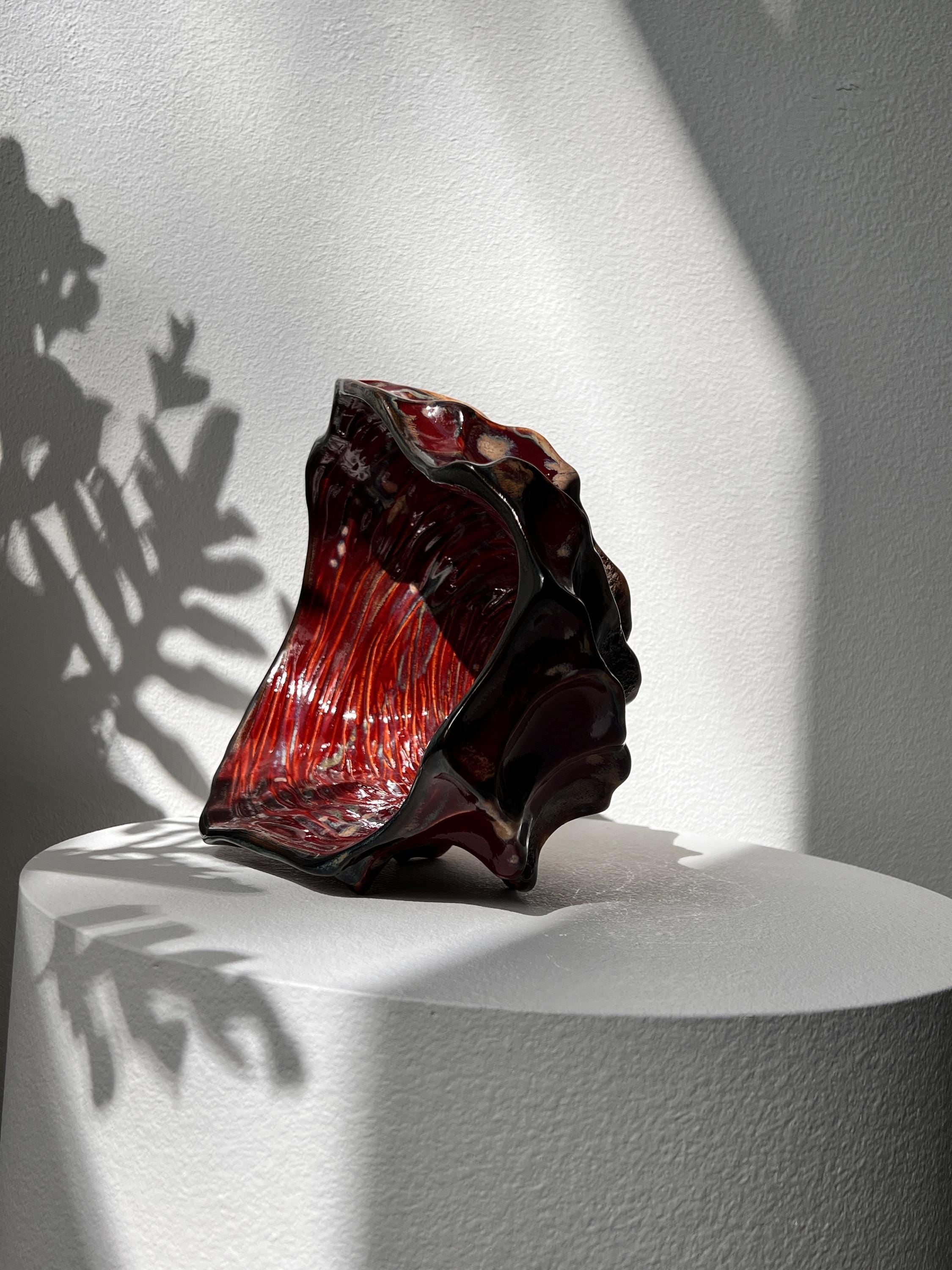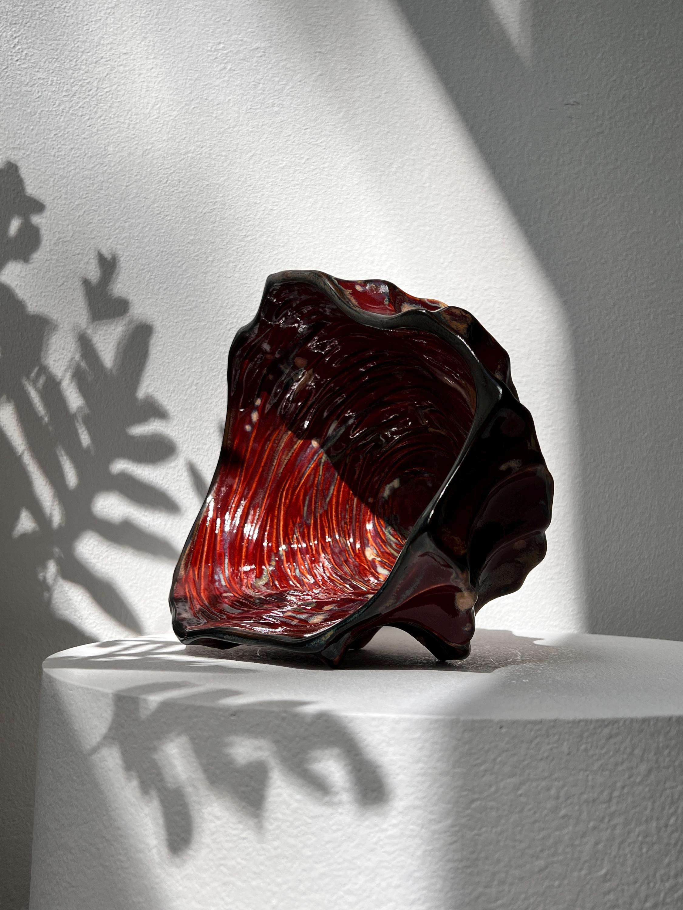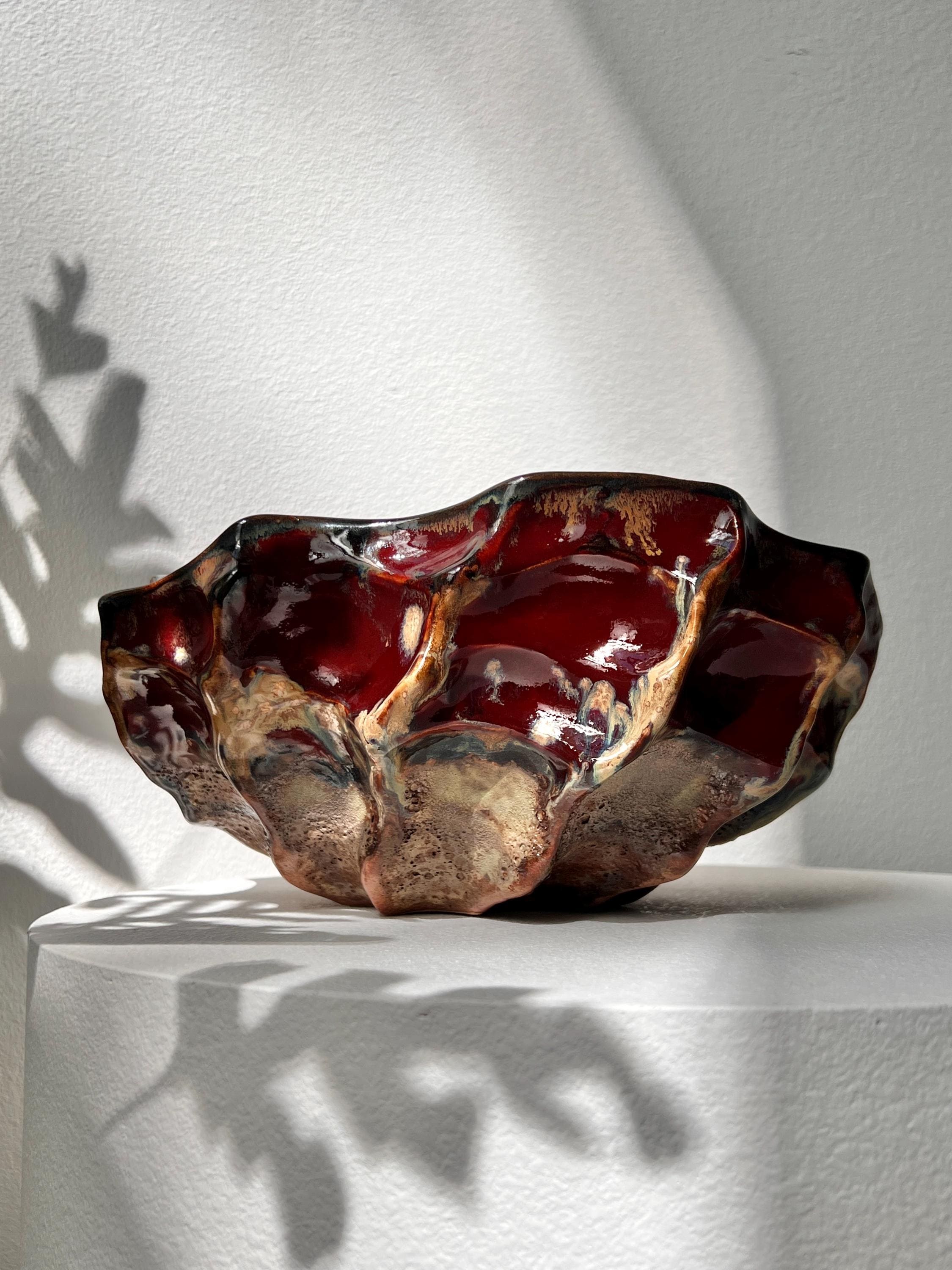 The interior is finished with a rich, glossy glaze in deep crimson which catche the light beautifully, while the exterior contrasts with earthy, raw textures and darker, volcanic hues.